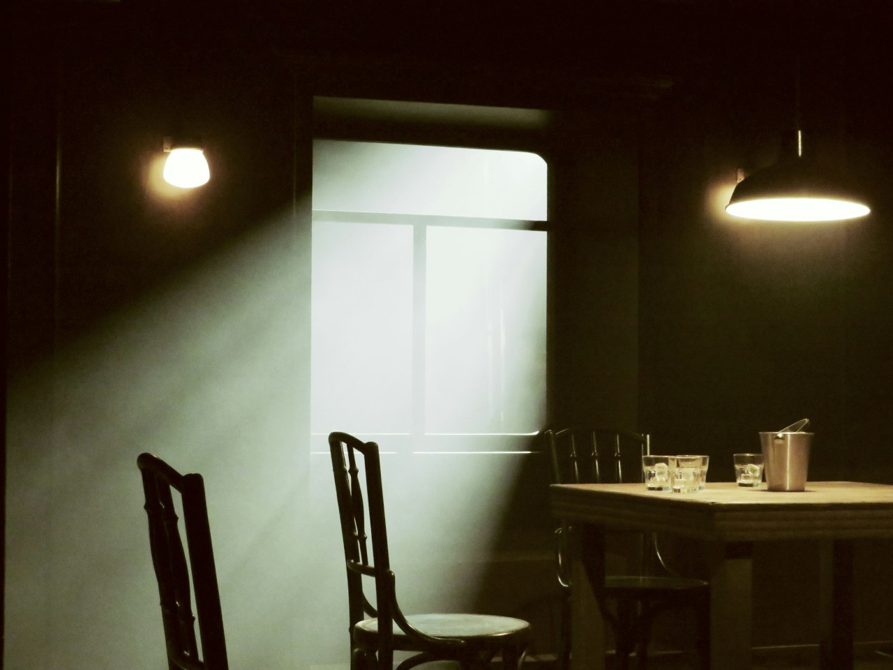 - Открытые стеллажи по обе стороны от окна.